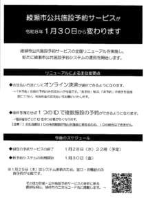 詳細は、リンク先(令和8年1月30日(金曜日)から公共施設予約サービスが変わります/綾瀬市)をご覧いただきますようお願いいたします。